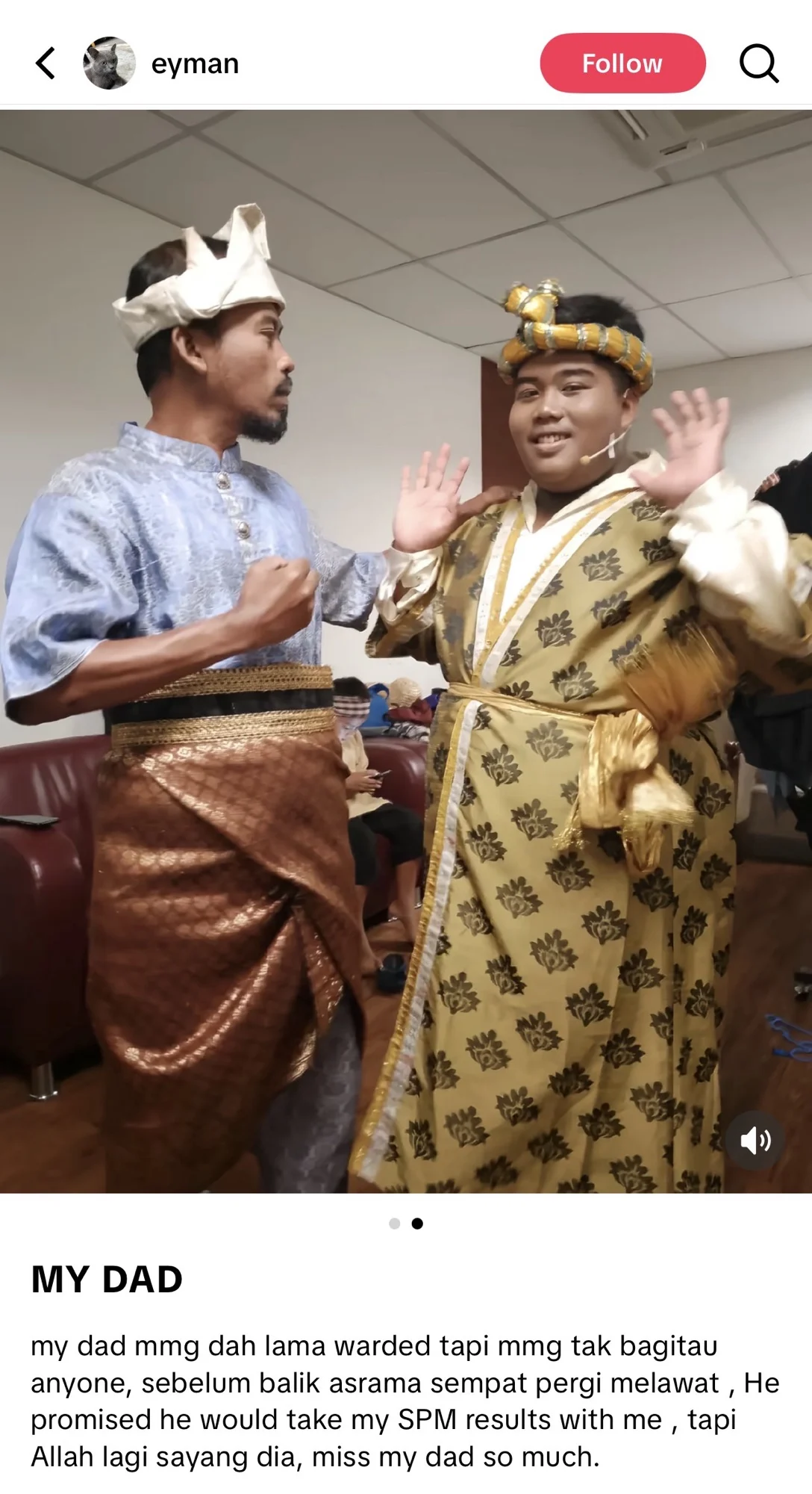 Dia janji dia akan ambil result SPM dengan saya. Tapi Allah lagi sayang dia. Rindu Bapa saya sangat-sangat.”-tulis Eyman di TikTok
