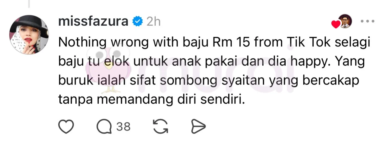“Nothing wrong dengan baju RM15 dari TikTok selagi baju tu elok untuk anak pakai dan dia happy. Yang buruk ialah sifat sombong syaitan yang bercakap tanpa memandang diri sendiri.”-tulis Fazura di Threads