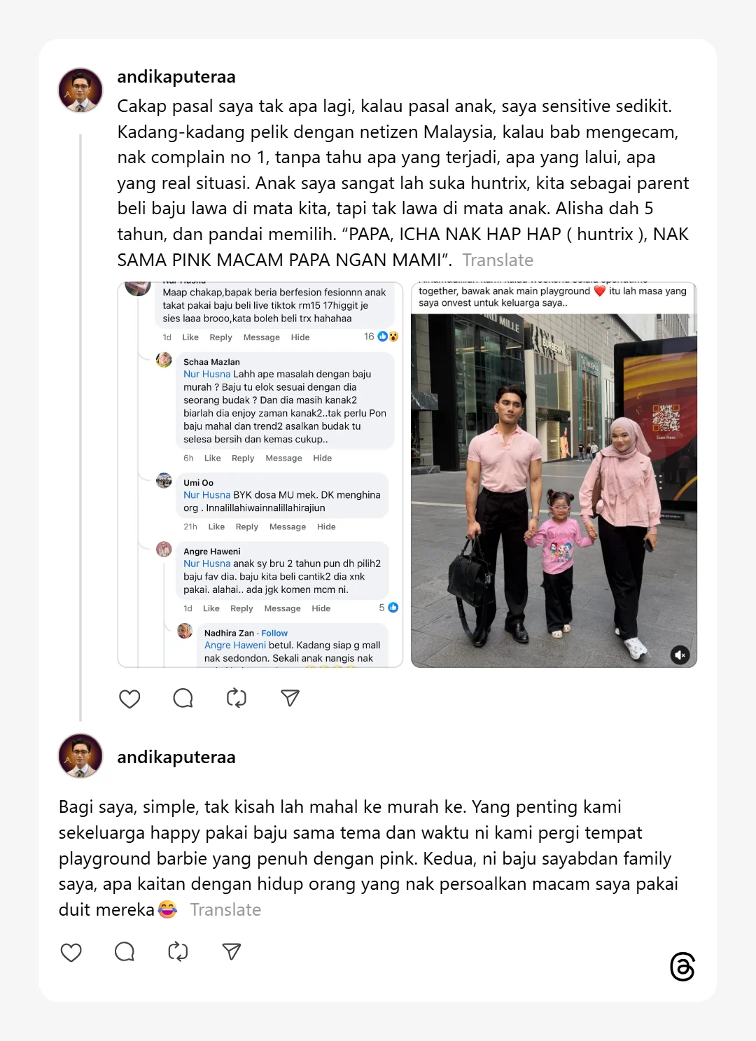 Bagi saya, simple, tak kisah lah mahal ke murah ke. Yang penting kami sekeluarga happy pakai baju sama tema dan waktu ni kami pergi tempat playground barbie yang penuh dengan pink. Kedua, ni baju sayabdan family saya, apa kaitan dengan hidup orang yang nak persoalkan macam saya pakai duit mereka 😂.”-tulis Andika di Threads