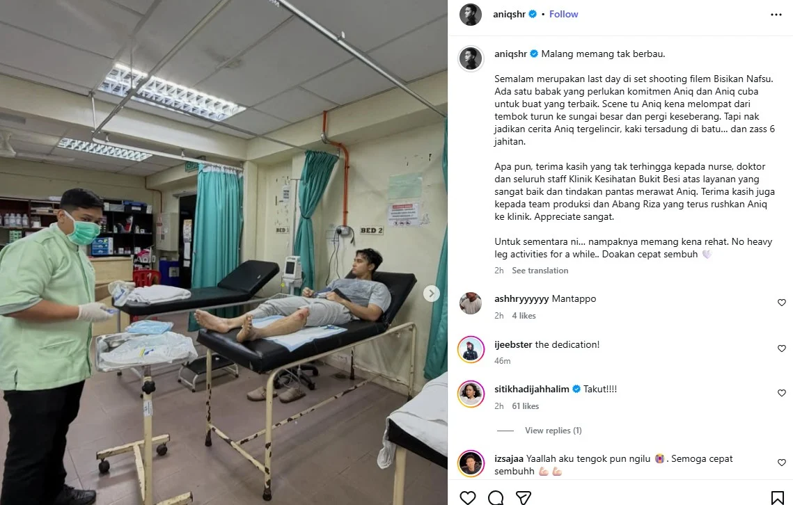 Terima kasih juga kepada team produksi dan Abang Riza yang terus rushkan Aniq ke klinik. Appreciate sangat.”-tambah Aniq