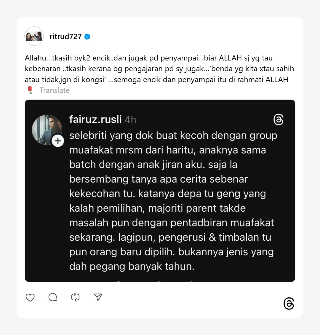 “Allahu, terima kasih banyak-banyak encik dan juga kepada penyampai. Biar Allah saja yang tahu kebenaran. Terima kasih kerana bagi pengajaran kepada saya jugak. ‘Benda yang kita tak tahu sahih atau tidak, jangan dikongsi’. Semoga Encik dan penyampai itu dirahmati Allah.”-respon Rita di Threads