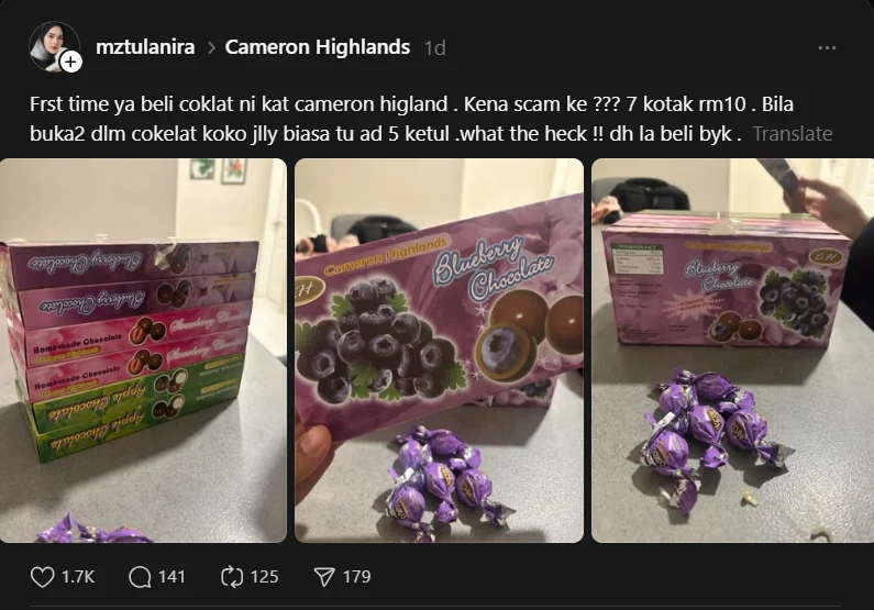 Harapan nak bawa pulang ole-ole manis dari Cameron Highlands bertukar menjadi kekecewaan apabila seorang pengguna Thread mendakwa coklat yang dibelinya langsung tidak seperti yang dibayangkan.