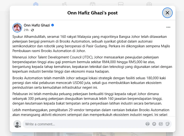 Berita menggembirakan itu dikongsikan sendiri oleh Menteri Besar Johor, Datuk Onn Hafiz Ghazi, sempena majlis pembukaan rasmi fasiliti Brooks Automation baru-baru ini.