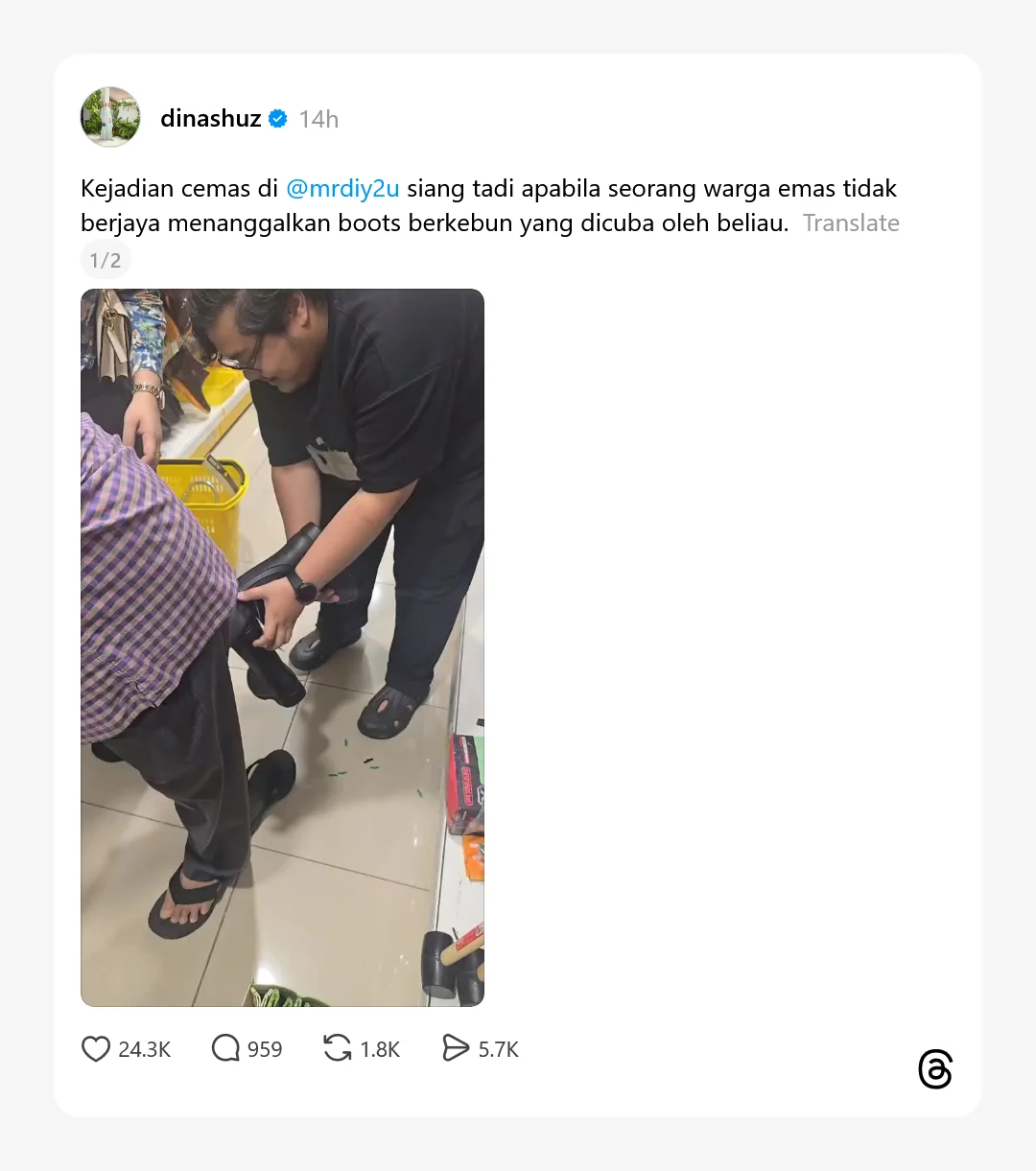 Menurut perkongsian di Thread, warga emas tersebut hanya berniat mencuba kasut getah berkebun berkenaan sebelum membuat keputusan untuk membeli.