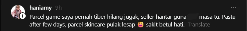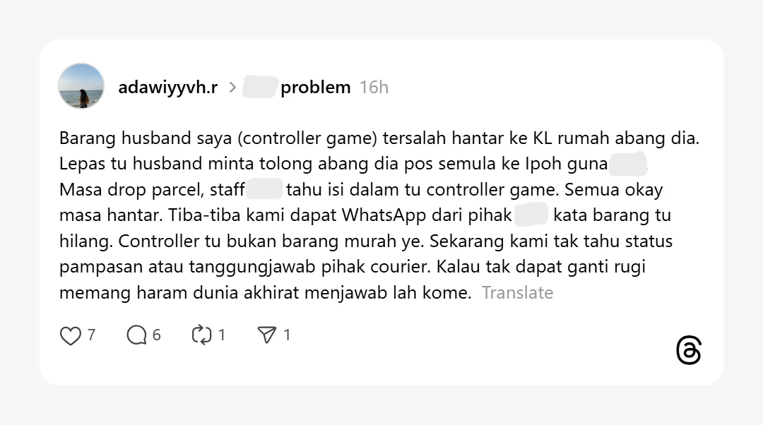 Menerusi satu hantaran yang tular di Thread, seorang wanita mendakwa barangan peribadi milik suaminya iaitu alat kawalan permainan video dilaporkan hilang selepas dihantar menggunakan perkhidmatan kurier.