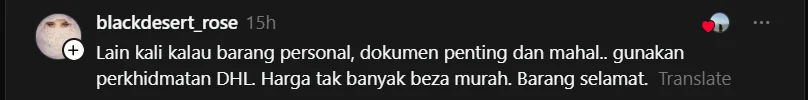 Dalam masa sama, terdapat juga netizen yang berkongsi pandangan dan nasihat berdasarkan pengalaman peribadi. Antara yang ditekankan ialah kepentingan mengambil perlindungan insurans untuk bungkusan bernilai tinggi, walaupun kosnya rendah.