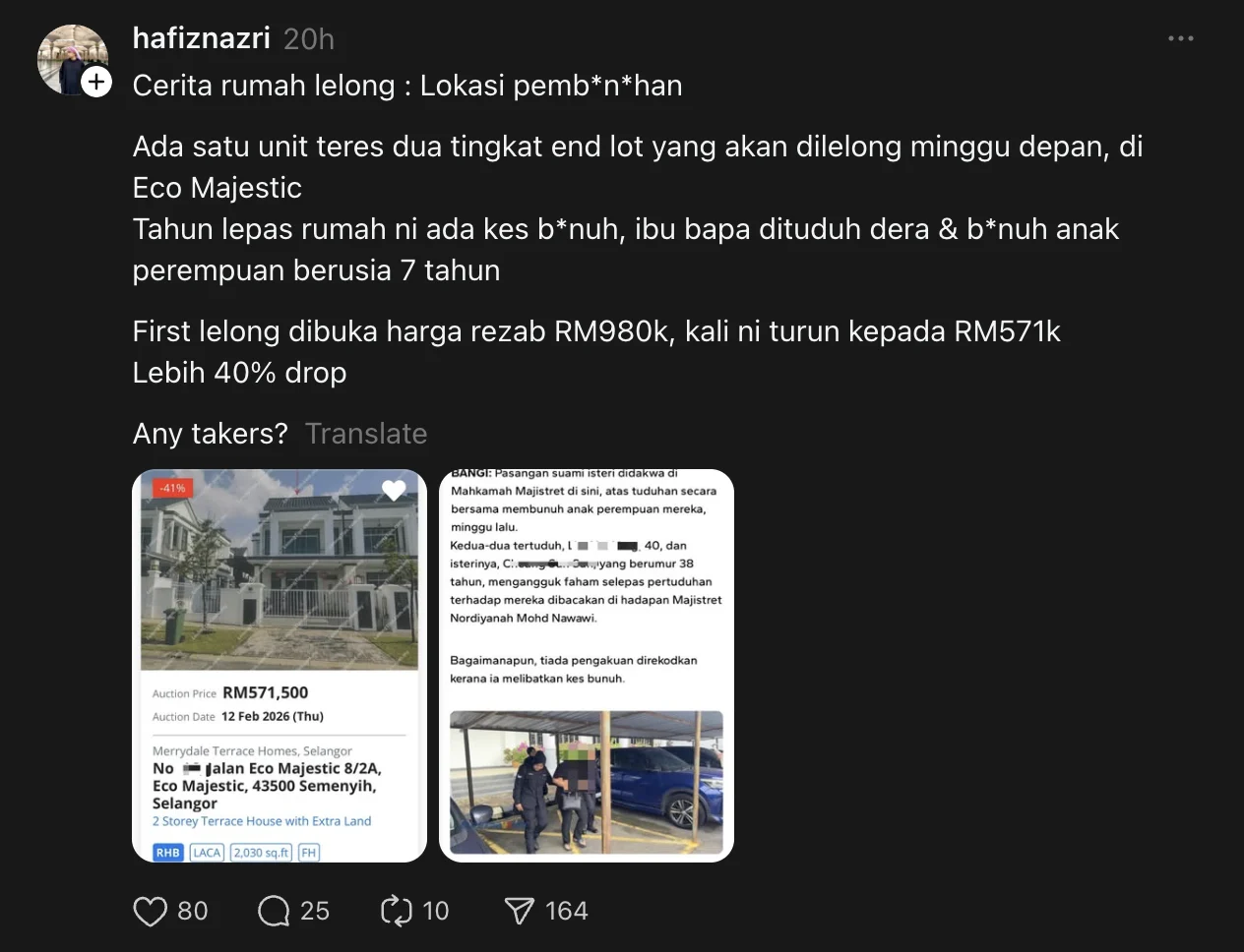 “Ada satu unit teres dua tingkat end lot yang akan dilelong minggu depan, di Eco Majestic. Tahun lepas rumah ini ada kes bunuh, ibu bapa dituduh dera & bunuh anak perempuan berusia 7 tahun. First lelong dibuka harga rezab RM980k, kali ni turun kepada RM571k. Lebih 40% drop.”