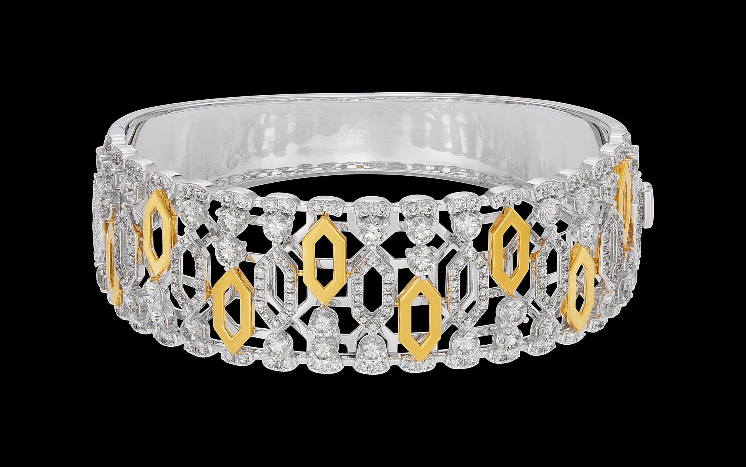 Antara yang mencuri perhatian MURAI ialah set yang menampilkan kilauan berlian bersama emas kuning, diinspirasikan daripada bentuk songket yang tersusun rapi. Diperbuat daripada emas putih dan emas kuning 18K, rekaan berlapis dan bertingkat memberi efek dimensi yang membuatkan pantulan cahaya nampak begitu elegan. Ia bold, eksklusif dan dalam masa sama kekal malar segar – memang pilihan tepat untuk mereka yang mahu buat statement di pagi Syawal.