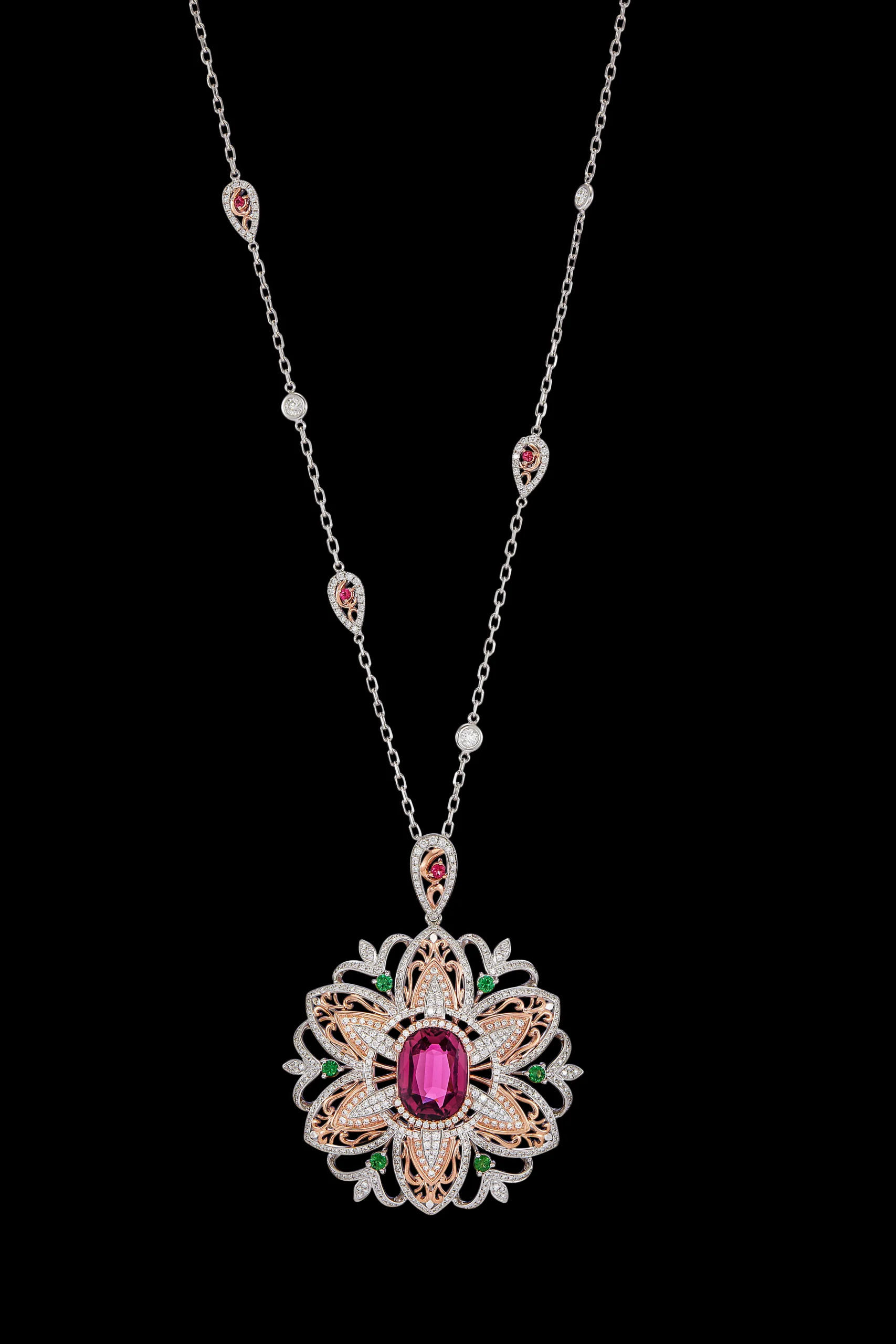 Selain itu, ada juga set yang mengetengahkan motif pucuk rebung, antara corak paling sinonim dalam tenunan songket. Menggunakan emas ros 18K, rekaan filigree yang halus digabungkan dengan inlay Mother-of-Pearl yang lembut bercahaya. Hasilnya cukup anggun tak terlalu sarat tetapi penuh dengan nilai seni dan warisan.