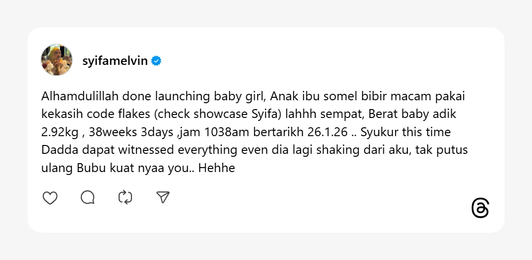 “Alhamdulillah done launching baby girl, Anak ibu somel bibir macam pakai kekasih code flakes (check showcase Syifa) lahhh sempat, Berat baby adik 2.92kg , 38weeks 3days ,jam 1038am bertarikh 26.1.26 ..
