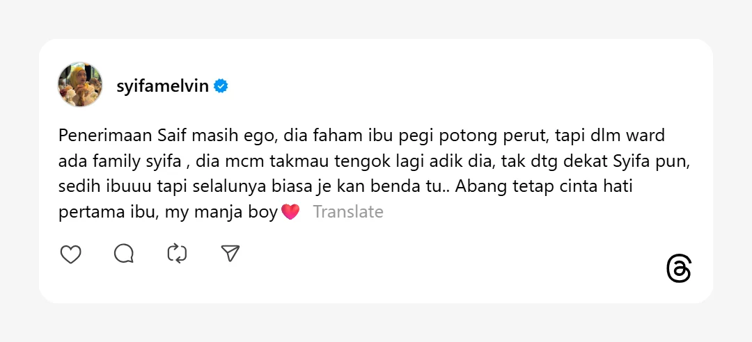 “Penerimaan Saif masih ego, dia faham ibu pergi potong perut, tapi dalam ward ada family Syifa, dia macam tak mahu tengok lagi adik dia, tak datang dekat Syifa pun.